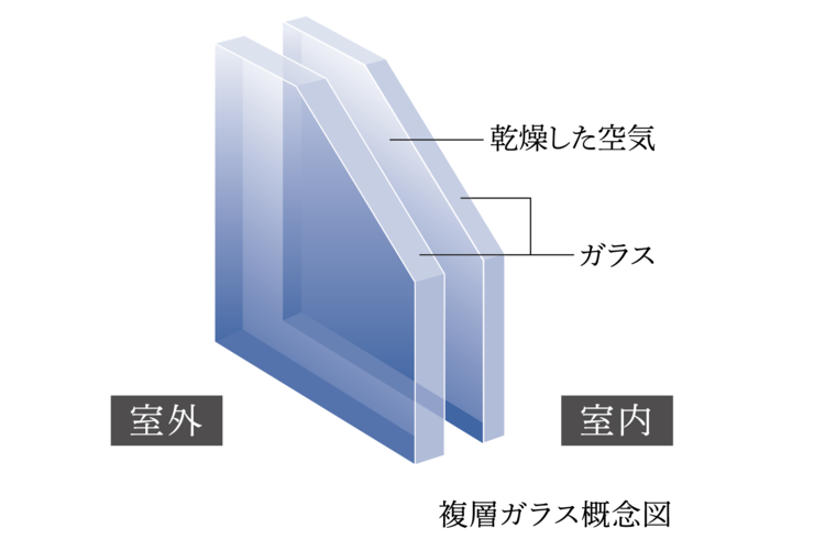 2枚の板ガラスの間に空気層を設けた複層ガラスによって、冷暖房の効果を高めると共に、室内の結露の発生を低減します。