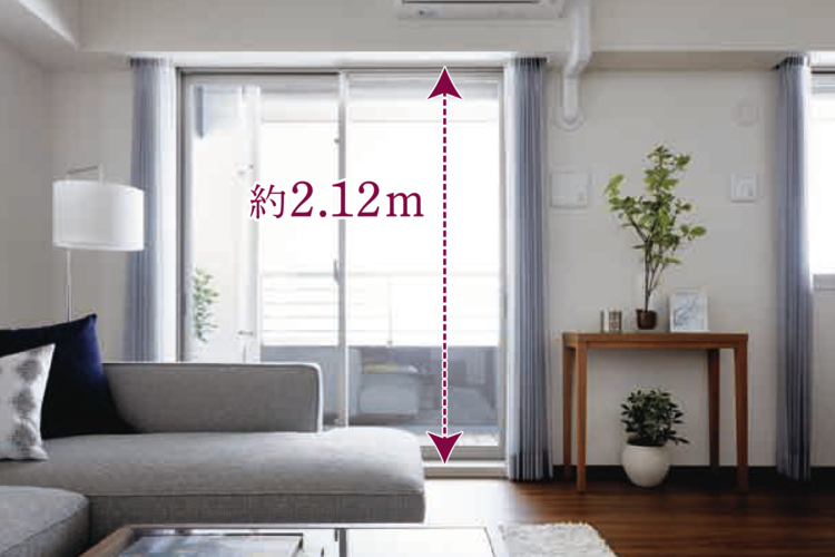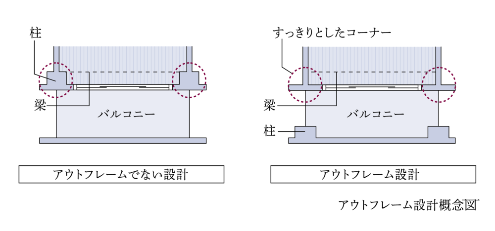 バルコニー面の柱を室内からバルコニーに移すことで、コーナーに柱型の出ないすっきりとしたスペースを実現。家具の配置のしやすさにも配慮されています。