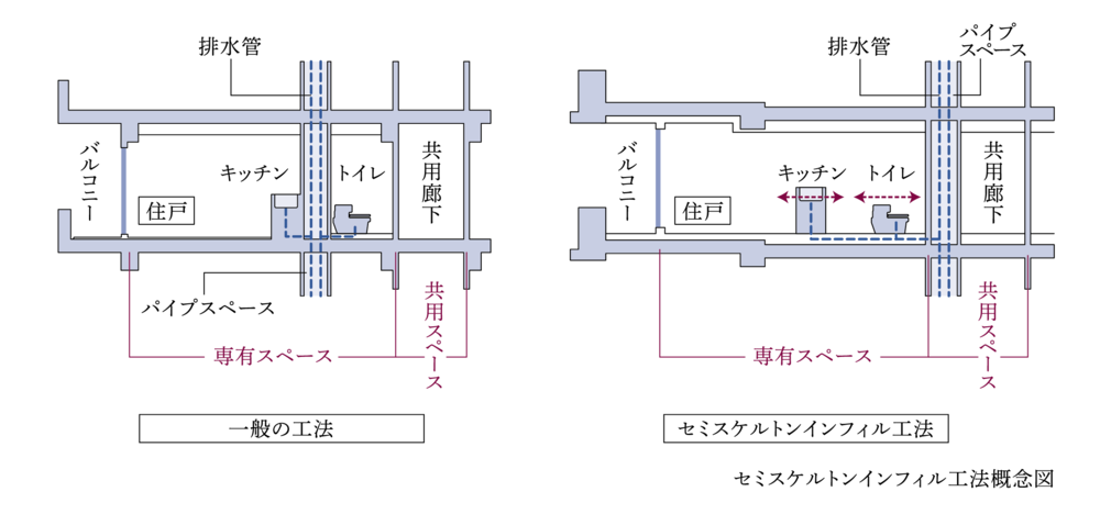 排水管のパイプスペースを共用廊下側に設置することで、ライフスタイルの変化に合わせた一定のリフォームにも配慮されています。